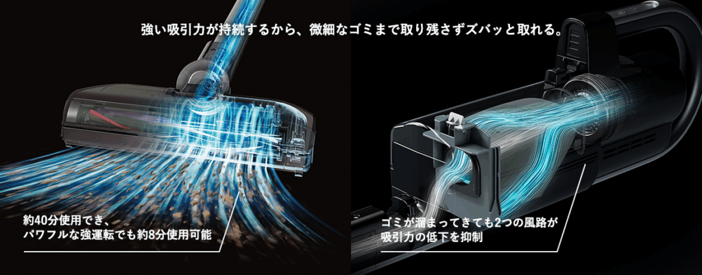 独自の小型高回転モーター(最大毎分約125,000回転)とサイクロン技術で、軽さと強力な吸引力を両立。