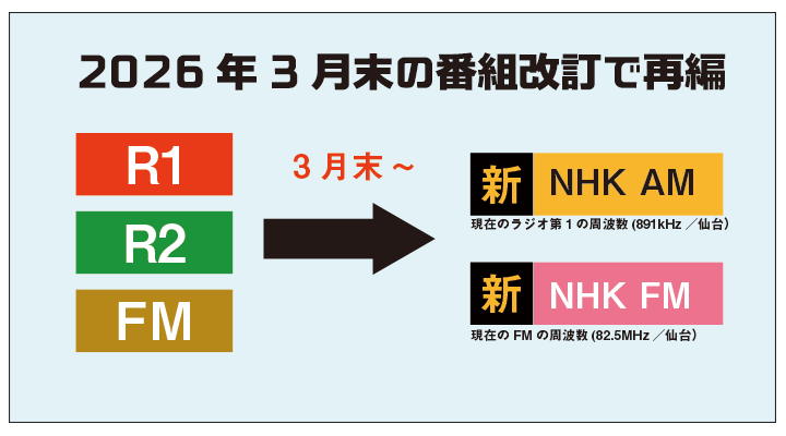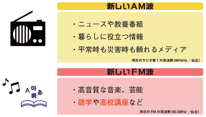 現在のラジオ第1・ラジオ第2・FMの3波から、新たに「AM波」「FM波」の2波体制へ生まれ変わります